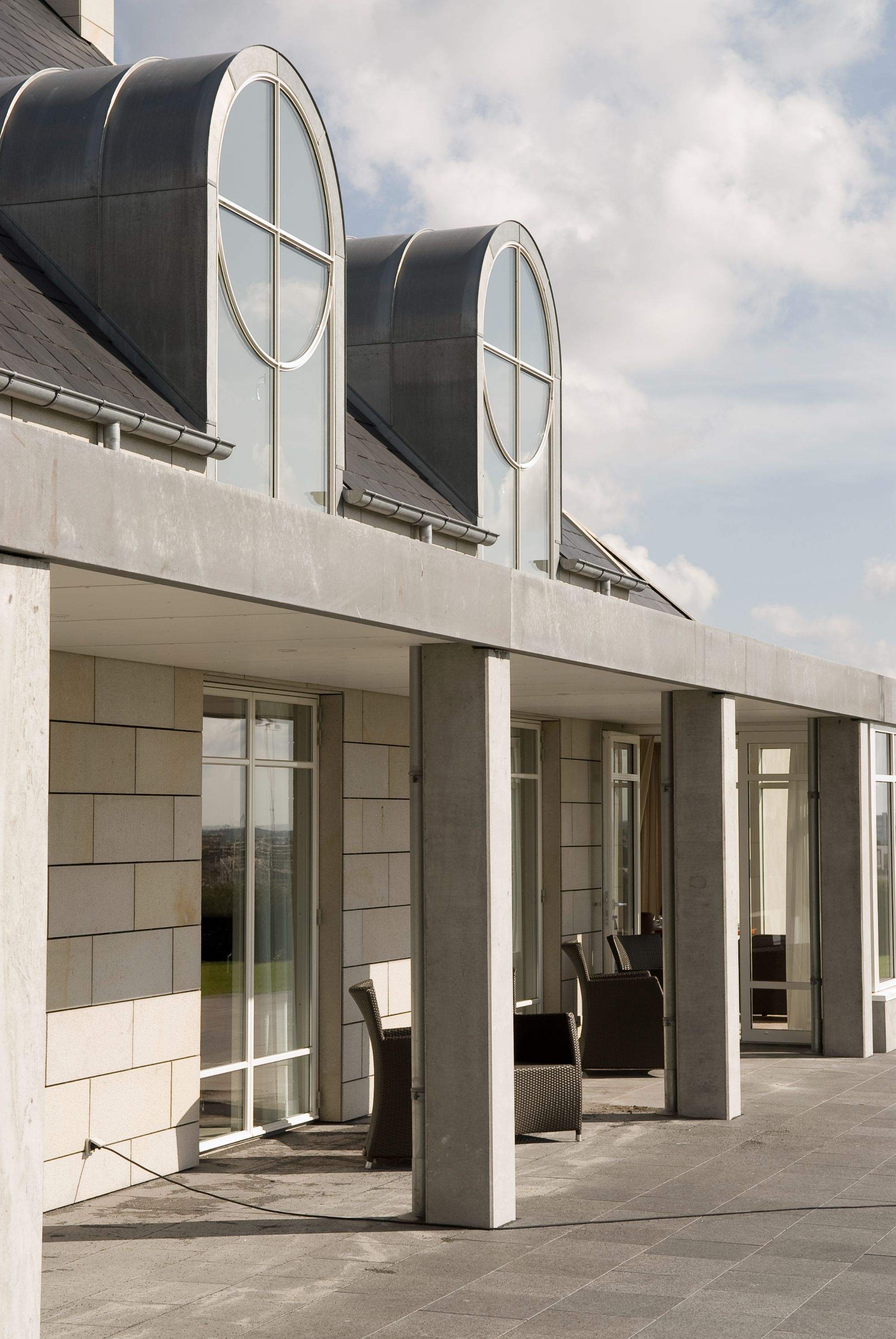 Bygningen er opført i kvalitetsmaterialer, så som naturskiffer på tagene, og som et arkitektonisk element er dele af facaderne beklædt med sandsten. Alle detaljer er omhyggeligt bearbejdet, så de fremtræder unikt og indgår som en helhed i den samlede komposition.